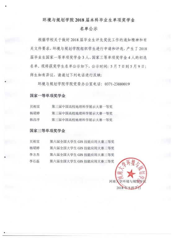 【公  示】环境与规划学院2018届本科毕业生单项奖学金名单公示